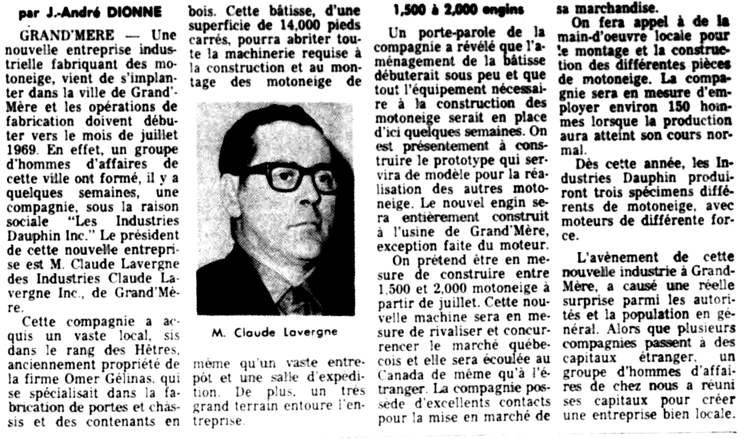 NEW INDUSTRY WAS BORN IN 1969, LES INDUSTRIES DAUPHIN WHO PRODUCES SNOWMOBILES.